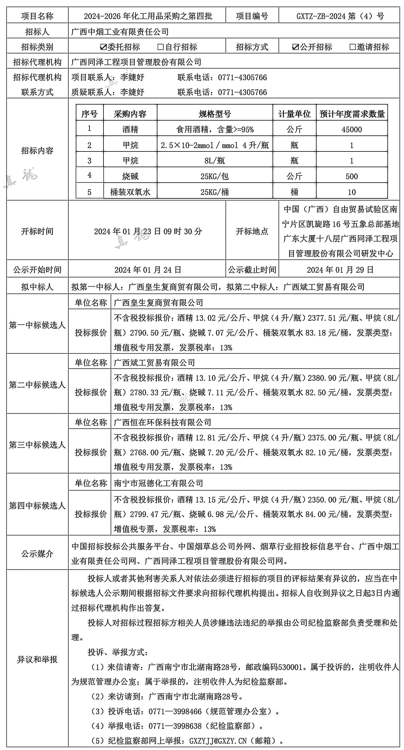 廣西中煙工業(yè)有限責(zé)任公司2024-2026年化工用品采購之第四批(項目編號:GXTZ-ZB-2024第(4)號)中標候選人公示