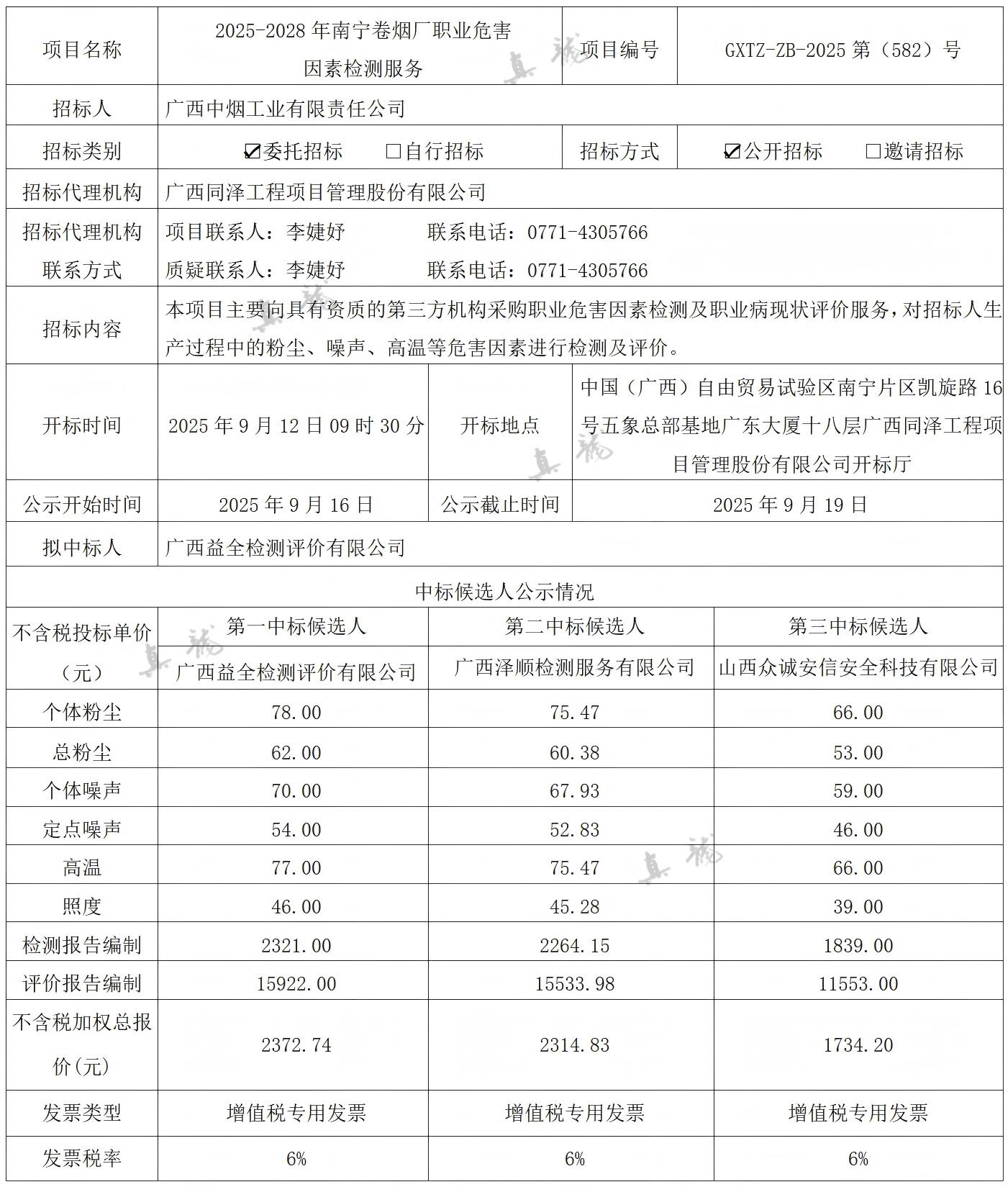 廣西中煙工業(yè)有限責(zé)任公司2025-2028年南寧卷煙廠職業(yè)危害因素檢測服務(wù)(項(xiàng)目編號:GXTZ-ZB-2025第(582)號)中標(biāo)候選人公示