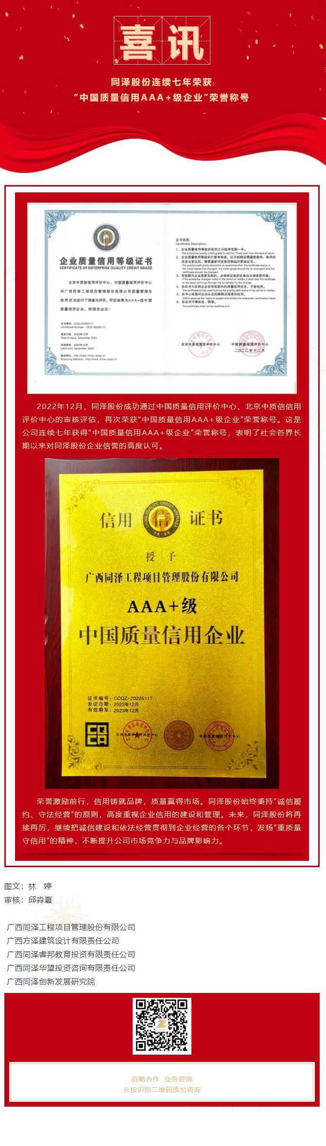喜訊 | 同澤股份連續(xù)七年榮獲“中國質(zhì)量信用AAA+級企業(yè)”榮譽(yù)稱號